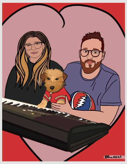 - Please note that this is a fun illustration and not a real-life portrait. This means that the facial features will not be the same as in the photos but the hairstyles and clothing styles will make the characters unique and each character is drawn individually.