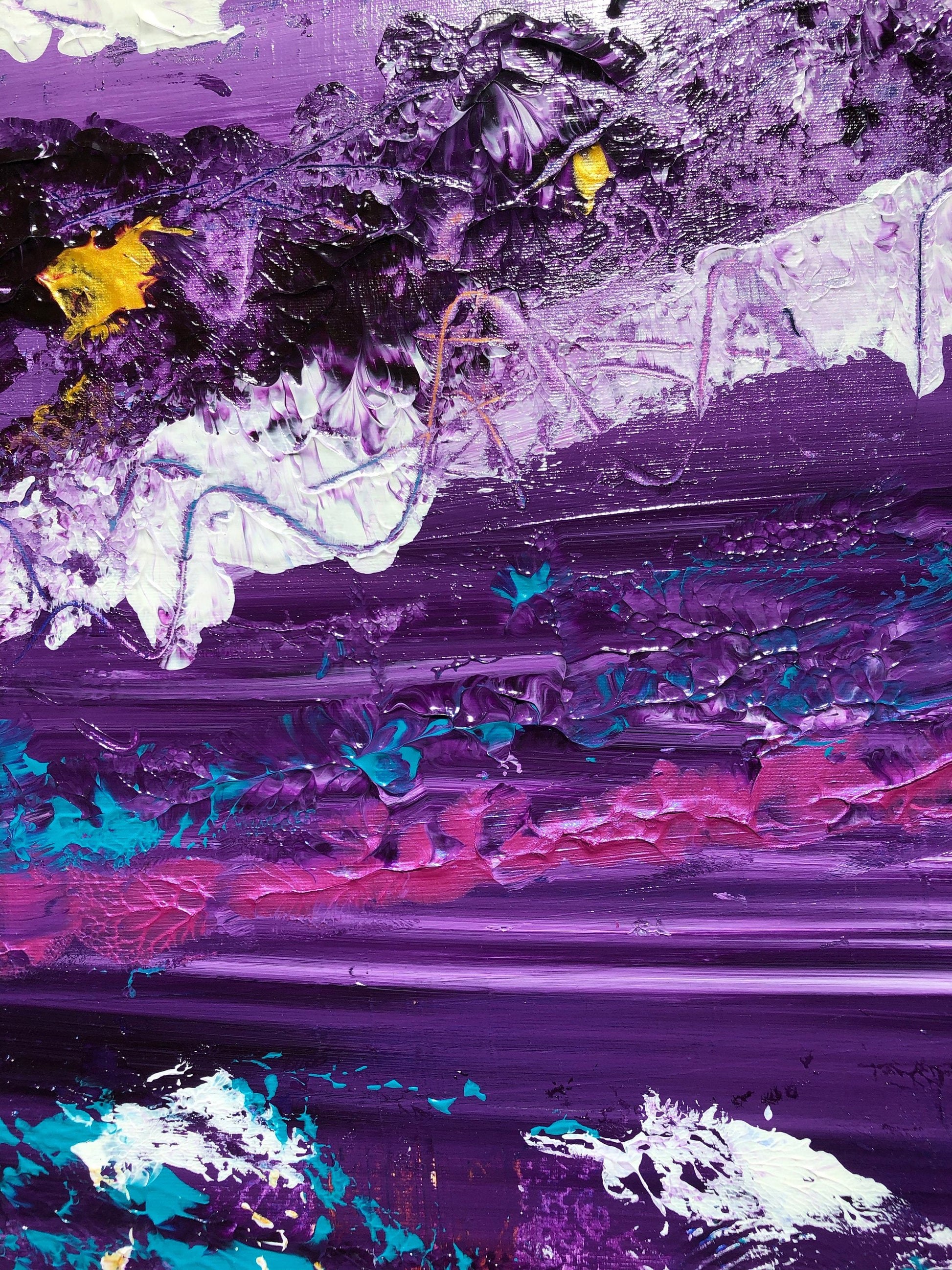 This painting is inspired by the Miami culture of the 80's and 90's. The colours are very vibrant and there is a lot of intricate texture. There are circular textured strokes that were done as a base before the painting was painted created. This creates a very cool party and celebratory feel. Would really work for that 90's or Miami Vice fan!